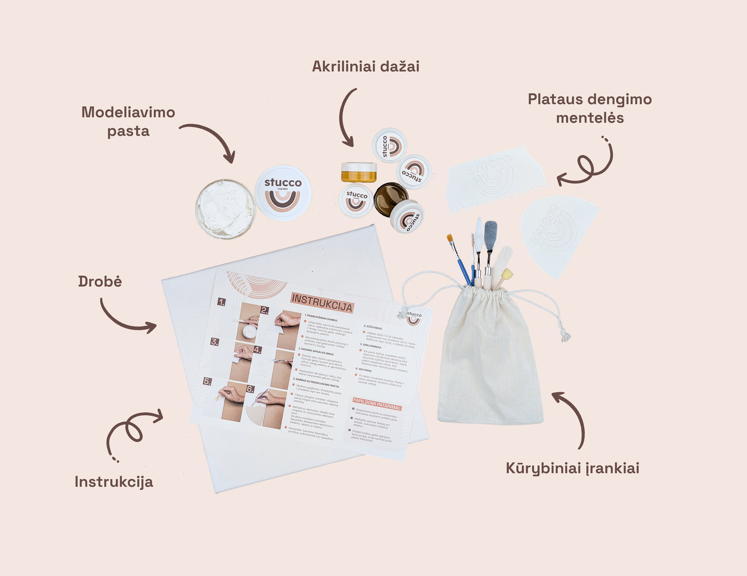 Šis rinkinys leidžia kurti unikalius paveikslus su mentelėmis ir tekstūriniu tinku. Tepkite tinką, formuokite, o išdžiūvus – pridėkite spalvų.